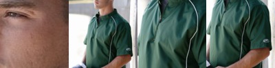 Contoured side seams and 4-button placket add dash to this stain-resistant jersey knit shirt.